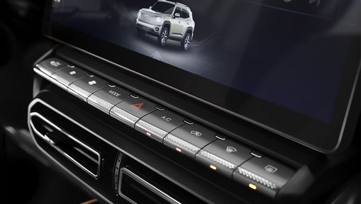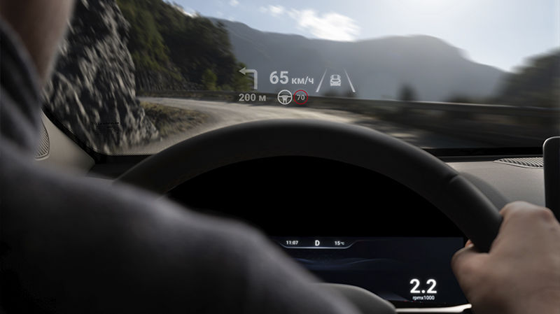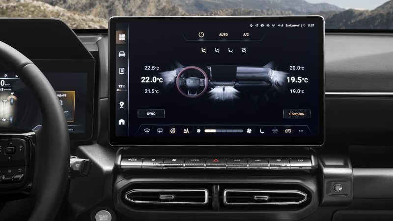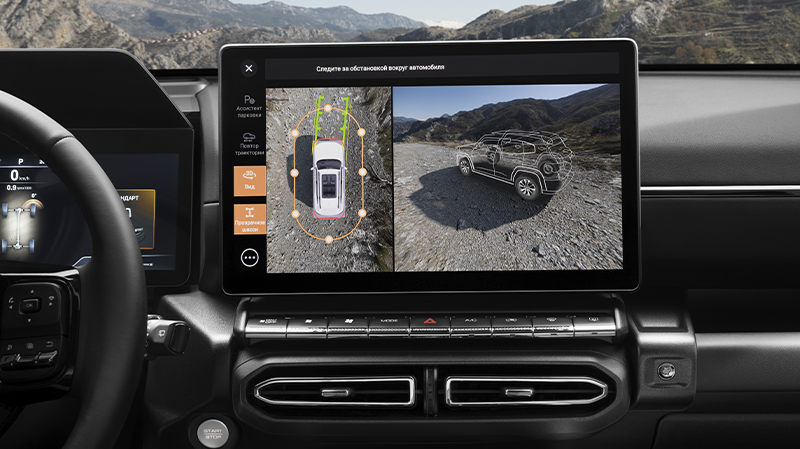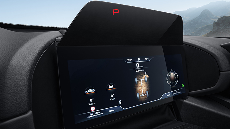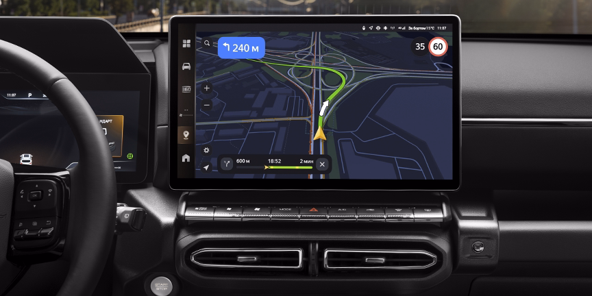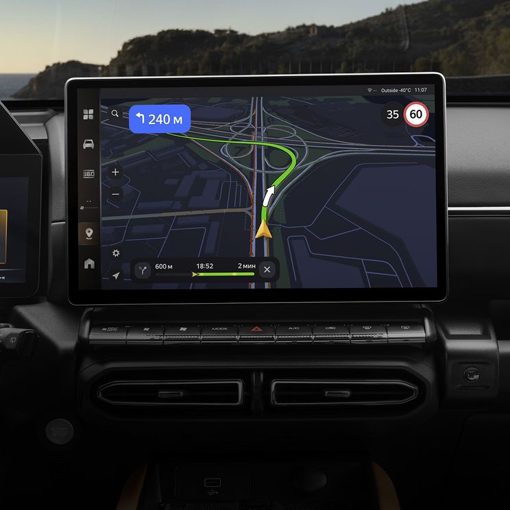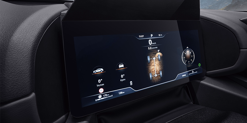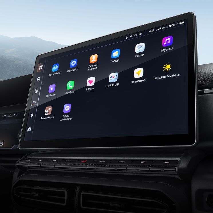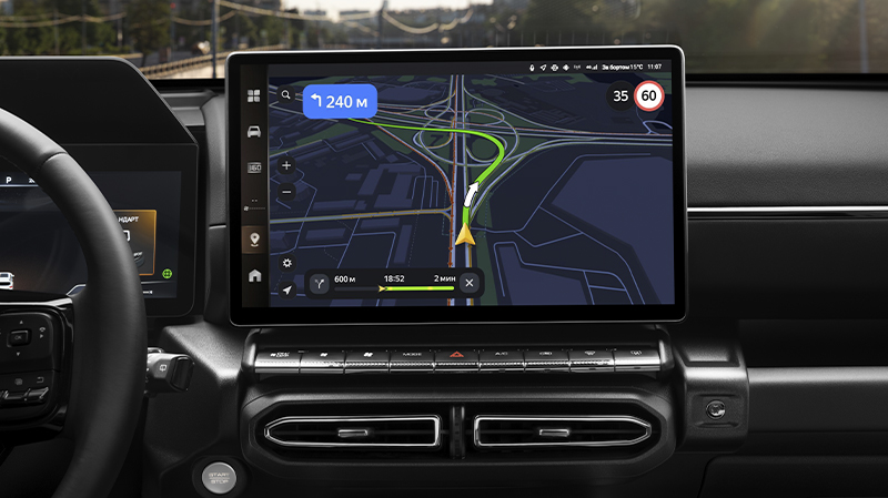 Большой мультимедийный экран высокого разрешения доминирует над центральной консолью, предлагая интуитивно понятный интерфейс с возможность голосового управления функциями автомобиля.